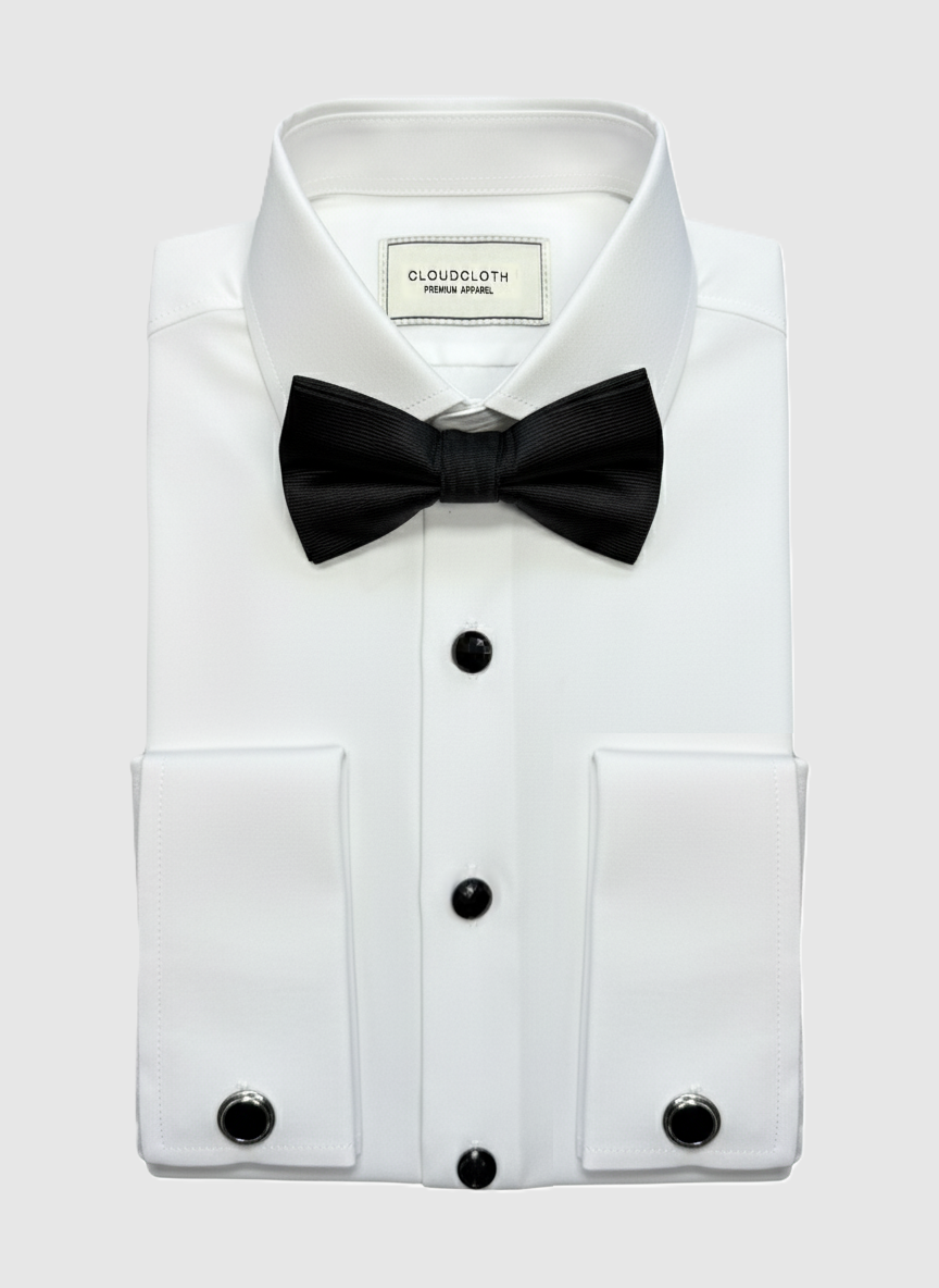 This refined tuxedo shirt brings a sleek, elevated presence to any formal look with its crisp finish and modern, performance-driven construction. Crafted from a premium 4-way stretch fabric, it delivers exceptional comfort and flexibility while maintaining a clean, structured silhouette. The smooth, white front is accented with classic black stud buttons and a perfectly shaped bow tie, offering timeless sophistication without sacrificing ease of movement. Finished with French cuffs and a tailored fit, it strikes the ideal balance between traditional elegance and contemporary comfort—made to shine at every black-tie moment.