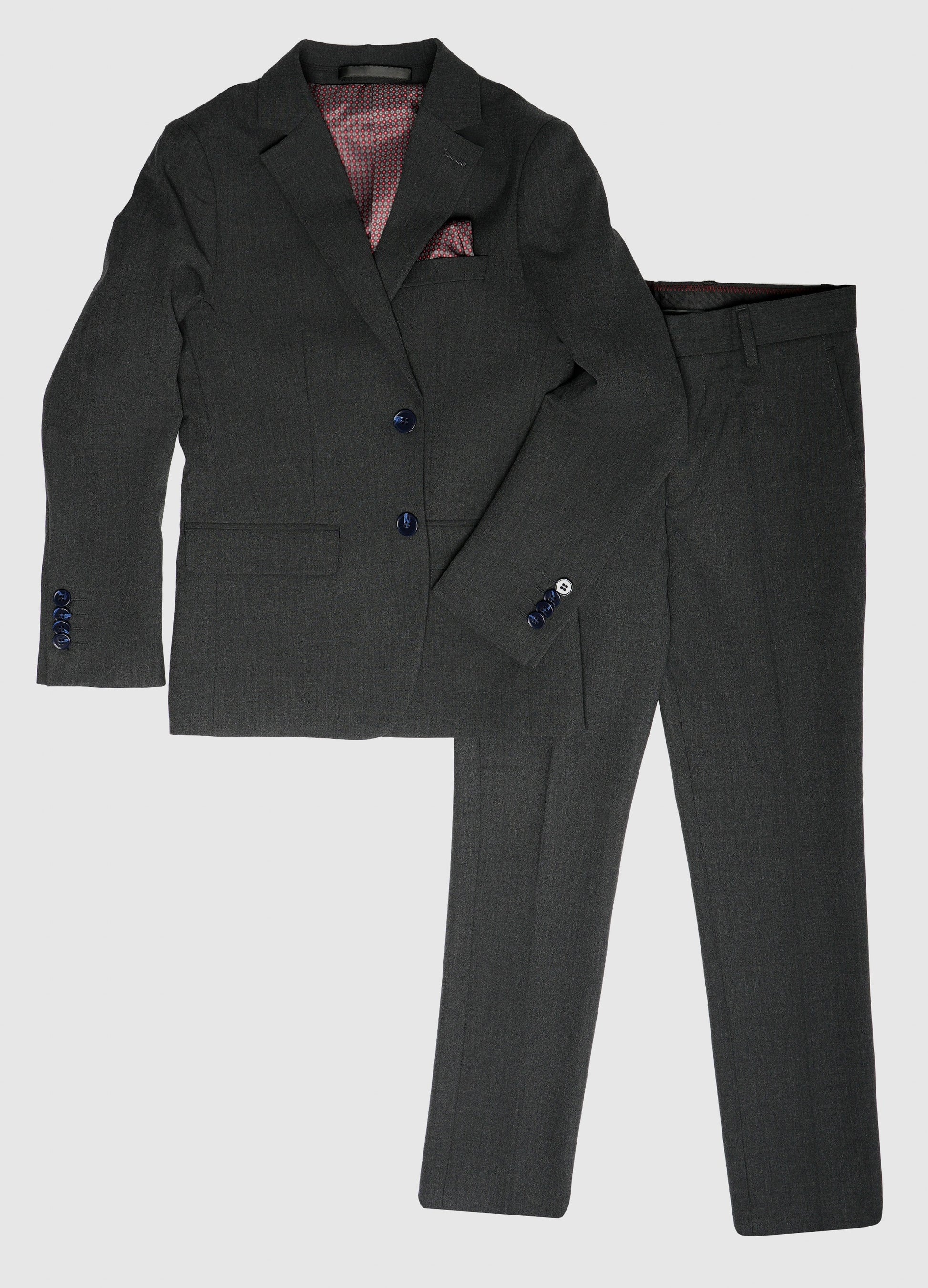 This modern tailored suit set offers a clean, timeless look crafted from a smooth, lightweight fabric that keeps kids comfortable without sacrificing polish. Its refined finish and subtle structure make it versatile for any formal occasion. Completed with a printed lining and matching pocket square, this two-piece set delivers effortless style with a classic silhouette—perfect for year-round celebrations.